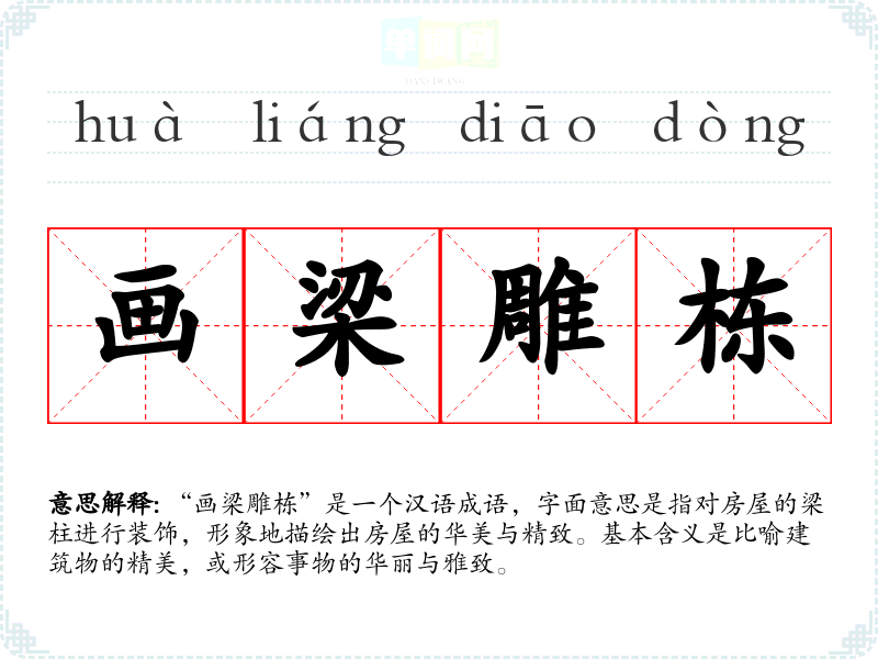 “画梁雕栋”是一个汉语成语,字面意思是指对房屋的梁柱进行装饰,形象地描绘出房屋的华美与精致。基本含义是比喻建筑物的精美,或形容事物的华丽与雅致。