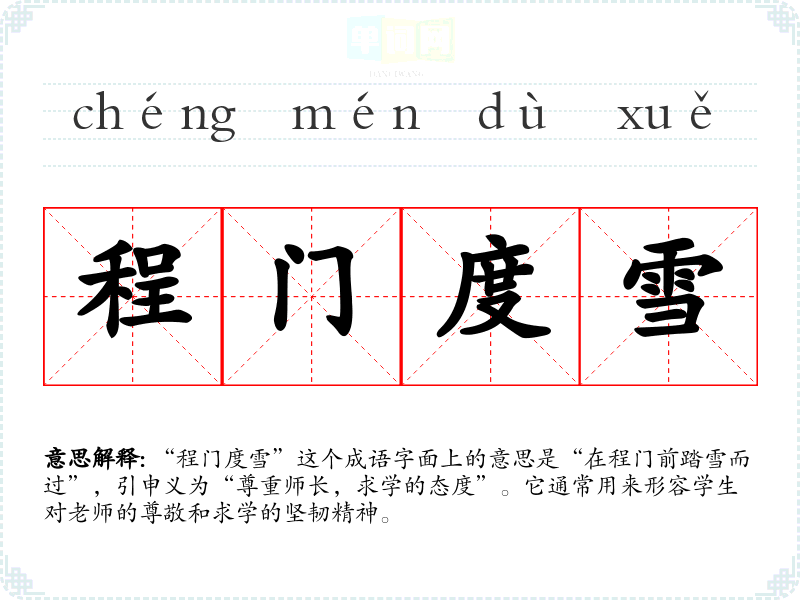 | 程门度雪 | 程:宋代理学家程颐。比喻尊师重教。 |