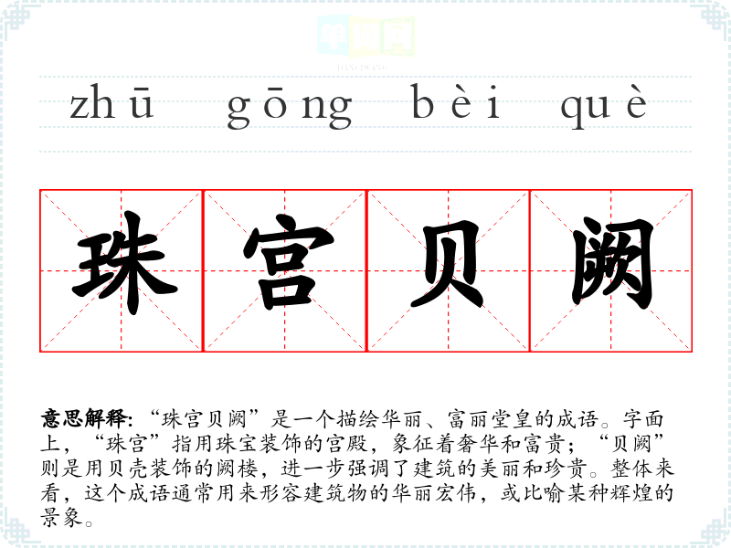 “珠宫贝阙”是一个描绘华丽、富丽堂皇的成语。字面上,“珠宫”指用珠宝装饰的宫殿,象征着奢华和富贵;“贝阙”则是用贝壳装饰的阙楼,进一步强调了建筑的美丽和珍贵。整体来看,这个成语通常用来形容建筑物的华丽宏伟,或比喻某种辉煌的景象。