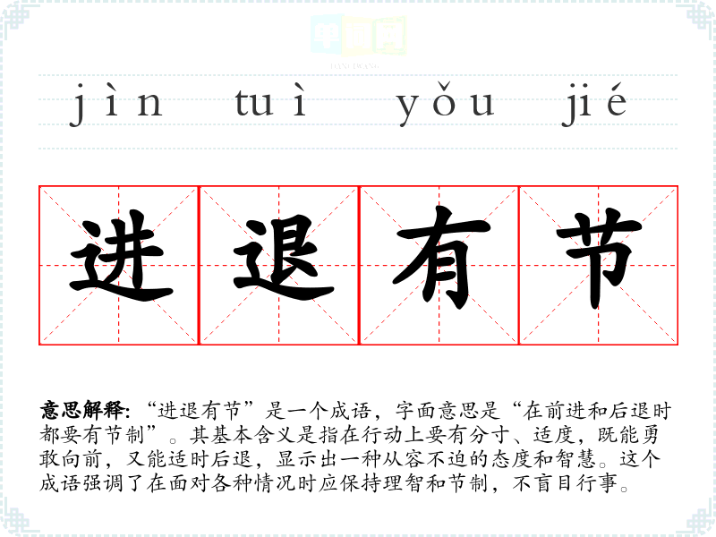 “进退有节”是一个成语,字面意思是“在前进和后退时都要有节制”。其基本含义是指在行动上要有分寸、适度,既能勇敢向前,又能适时后退,显示出一种从容不迫的态度和智慧。这个成语强调了在面对各种情况时应保持理智和节制,不盲目行事。