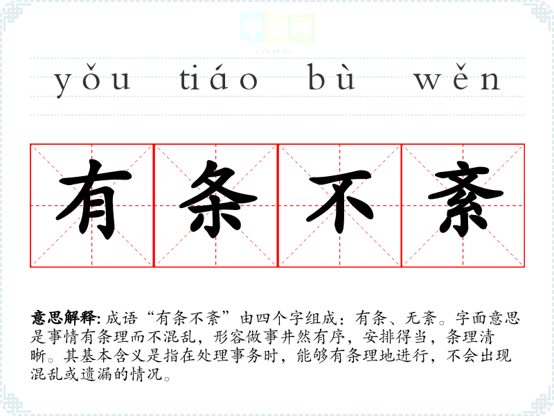 成语“有条不紊”由四个字组成:有条、无紊。字面意思是事情有条理而不混乱,形容做事井然有序,安排得当,条理清晰。其基本含义是指在处理事务时,能够有条理地进行,不会出现混乱或遗漏的情况。