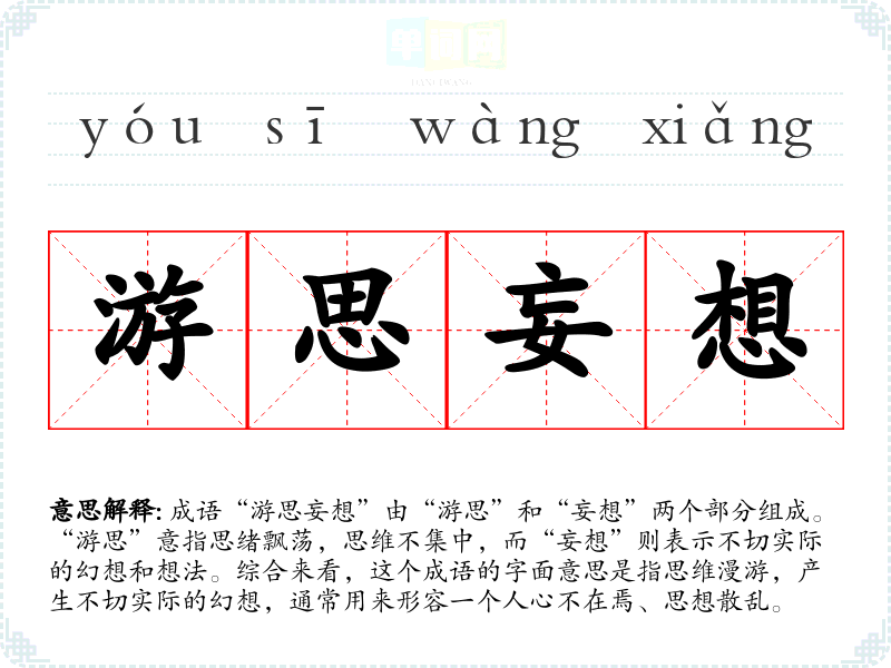 成语“游思妄想”由“游思”和“妄想”两个部分组成。“游思”意指思绪飘荡,思维不集中,而“妄想”则表示不切实际的幻想和想法。综合来看,这个成语的字面意思是指思维漫游,产生不切实际的幻想,通常用来形容一个人心不在焉、思想散乱。