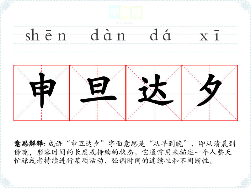 成语“申旦达夕”字面意思是“从早到晚”,即从清晨到傍晚,形容时间的长度或持续的状态。它通常用来描述一个人整天忙碌或者持续进行某项活动,强调时间的连续性和不间断性。