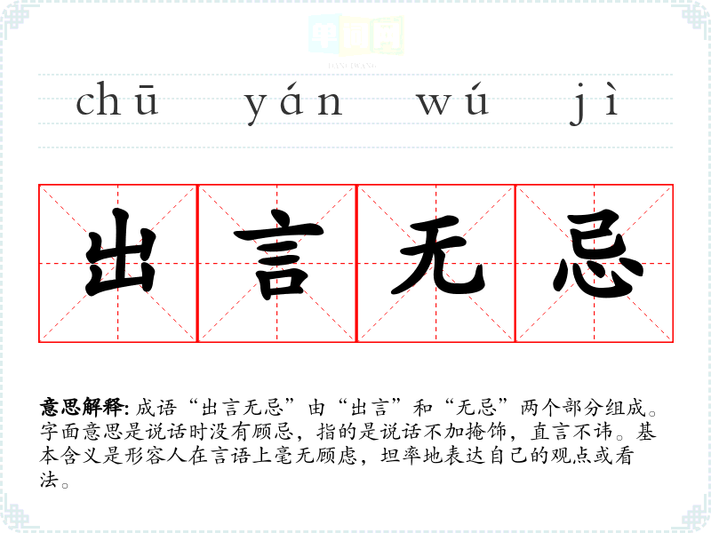 成语“出言无忌”由“出言”和“无忌”两个部分组成。字面意思是说话时没有顾忌,指的是说话不加掩饰,直言不讳。基本含义是形容人在言语上毫无顾虑,坦率地表达自己的观点或看法。