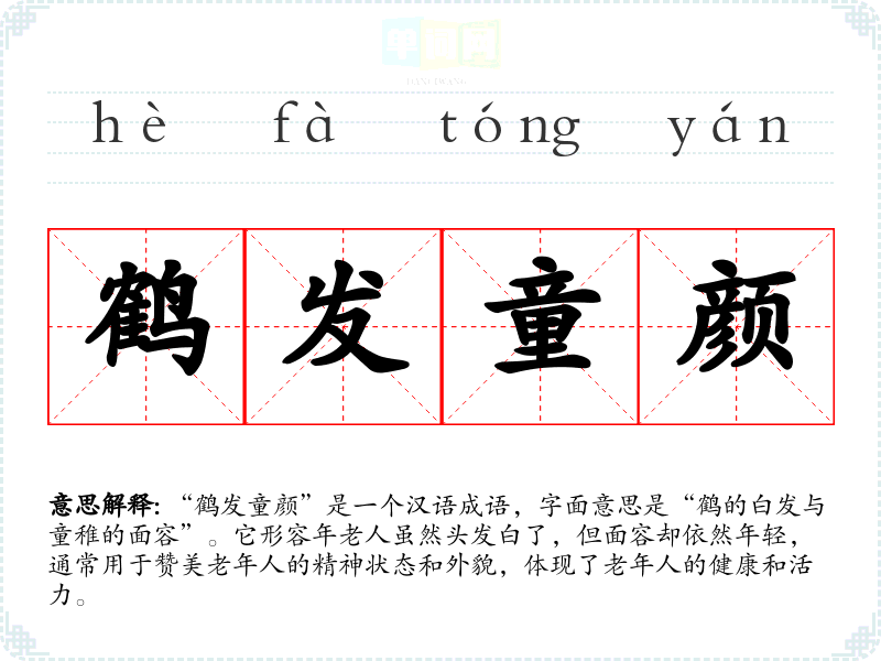 “鹤发童颜”是一个汉语成语,字面意思是“鹤的白发与童稚的面容”。它形容年老人虽然头发白了,但面容却依然年轻,通常用于赞美老年人的精神状态和外貌,体现了老年人的健康和活力。