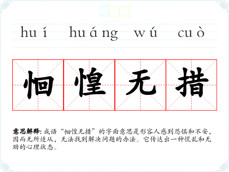 “恛惶无措”并没有明确的历史典故,但词语中的每个字都有其独特的含义。“恛”(chí)意为恐惧、惊慌;“惶”(huáng)则表示急迫、焦虑;“无措”指的是没有办法、没有措施。这个成语可以看作是对人们在面临困境时心理状态的生动描绘。