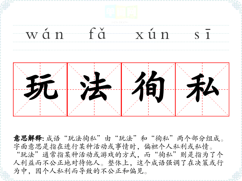 成语“玩法徇私”由“玩法”和“徇私”两个部分组成。字面意思是指在进行某种活动或事情时,偏袒或私情。“玩法”通常指某种活动或游戏的方式,而“徇私”则是指为了个人利益而不公正地对待他人。整体上,这个成语强调了在决策或行为中,因而导致的不公正和偏见。
