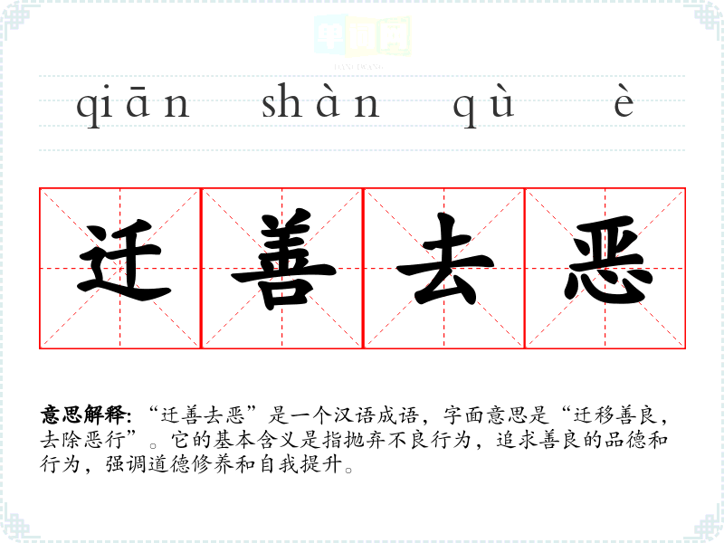 “迁善去恶”是一个汉语成语,字面意思是“迁移善良,去除恶行”。它的基本含义是指抛弃不良行为,追求善良的品德和行为,强调道德修养和自我提升。