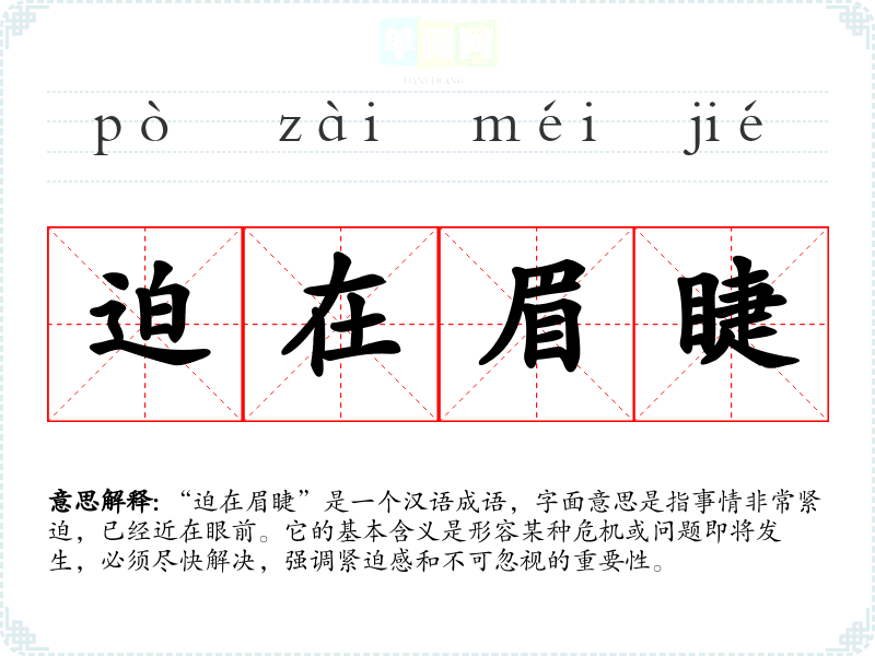 | 迫于眉睫 | 迫:迫近;眉睫:指眼前。形容事情已到眼前,情势十分紧迫。 |