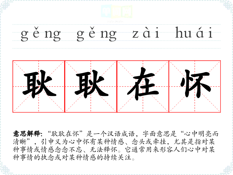 “耿耿在怀”是一个汉语成语,字面意思是“心中明亮而清晰”,引申义为心中怀有某种情感、念头或牵挂,尤其是指对某种事情或情感念念不忘、无法释怀。它通常用来形容人们心中对某种事情的执念或对某种情感的持续关注。