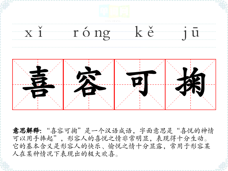 “喜容可掬”是一个汉语成语,字面意思是“喜悦的神情可以用手捧起”,形容人的喜悦之情非常明显,表现得十分生动。它的基本含义是形容人的快乐、愉悦之情十分显露,常用于形容某人在某种情况下表现出的极大欢喜。