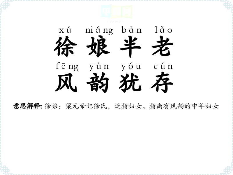 | 徐娘半老 | 徐娘:指梁元帝妃徐氏。指尚有风韵的中年妇女。 |