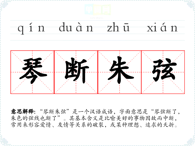 “琴断朱弦”是一个汉语成语,字面意思是“琴弦断了,朱色的弦线也断了”。其基本含义是比喻美好的事物因故而中断,常用来形容爱情、友情等关系的破裂,或某种理想、追求的夭折。