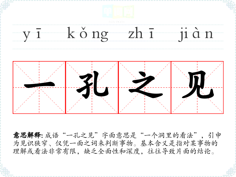 成语“一孔之见”字面意思是“一个洞里的看法”,引申为见识狭窄、仅凭一面之词来判断事物。基本含义是指对某事物的理解或看法非常有限,缺乏全面性和深度,往往导致片面的结论。