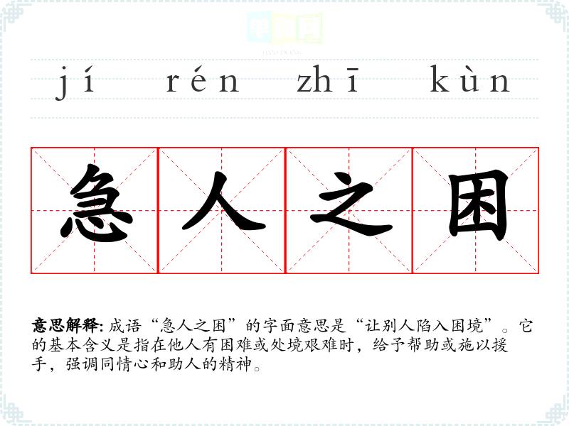 该成语的来源并不十分明确,但可以追溯到古代文献中有关施助和同情的论述。成语中的“急人”指的是他人急需帮助的状态,而“困”则是指困难或困境。通过对这些字词的理解,可以看出这一成语鼓励人们在他人遇到困难时,尽量伸出援手。
