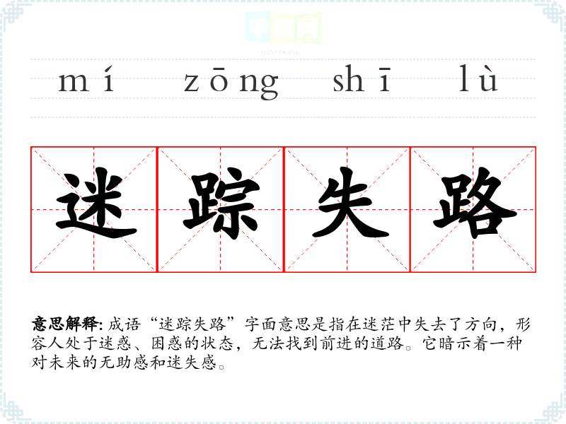 成语“迷踪失路”字面意思是指在迷茫中失去了方向,形容人处于迷惑、困惑的状态,无法找到前进的道路。它暗示着一种对未来的无助感和迷失感。