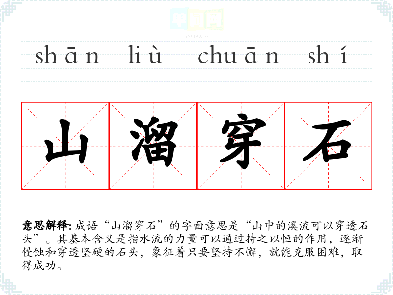 成语“山溜穿石”的字面意思是“山中的溪流可以穿透石头”。其基本含义是指水流的力量可以通过持之以恒的作用,逐渐侵蚀和穿透坚硬的石头,象征着只要坚持不懈,就能克服困难,取得成功。