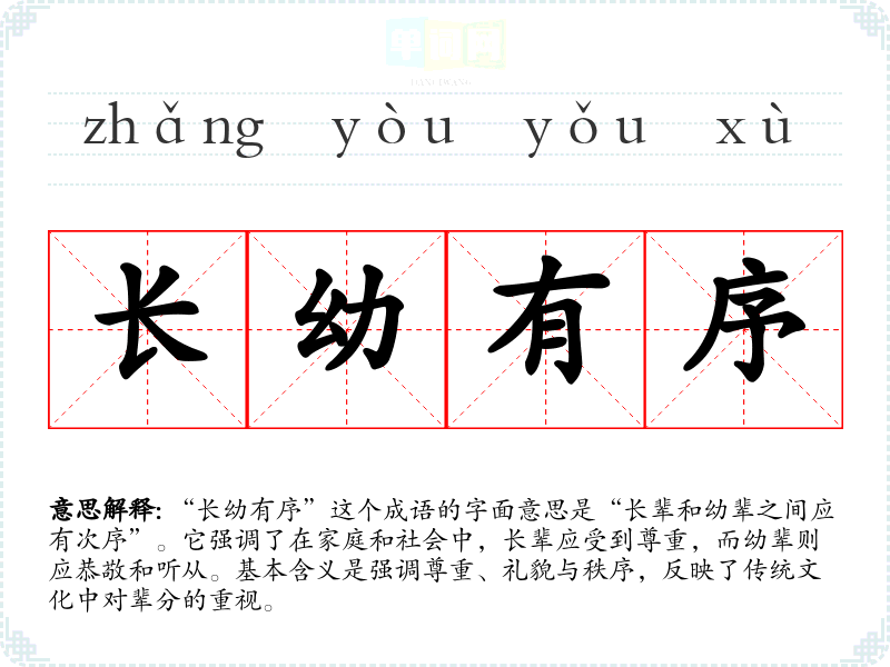 “长幼有序”这个成语的字面意思是“长辈和幼辈之间应有次序”。它强调了在家庭和社会中,长辈应受到尊重,而幼辈则应恭敬和听从。基本含义是强调尊重、礼貌与秩序,反映了传统文化中对辈分的重视。
