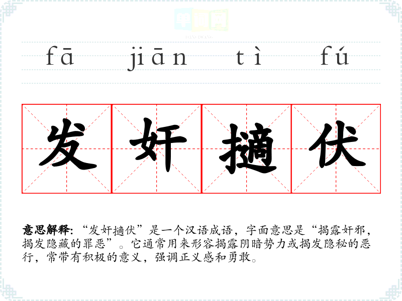 | 发奸擿伏 | 发、擿:揭发;奸:奸臣,坏人;伏:指隐瞒坏事。揭发隐秘的坏人坏事。 |