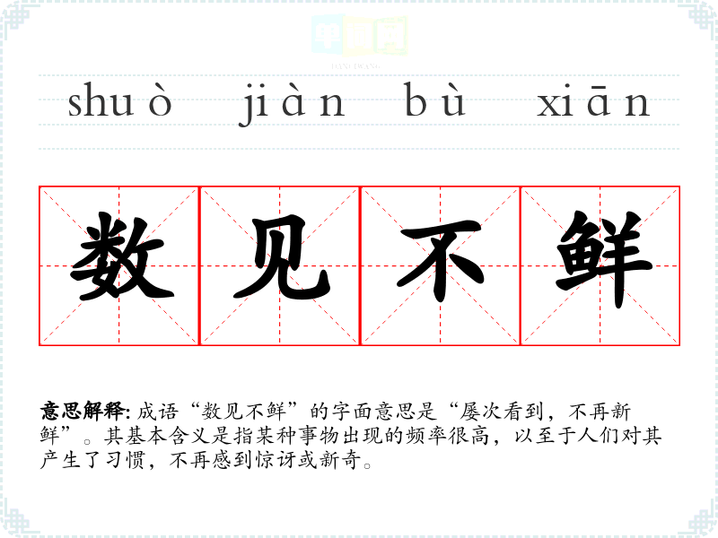 成语“数见不鲜”的字面意思是“屡次看到,不再新鲜”。其基本含义是指某种事物出现的频率很高,以至于人们对其产生了*惯,不再感到惊讶或新奇。