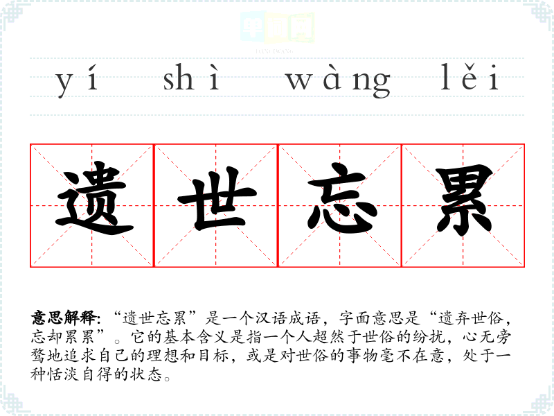 “遗世忘累”是一个汉语成语,字面意思是“遗弃世俗,忘却累累”。它的基本含义是指一个人超然于世俗的纷扰,心无旁骛地追求自己的理想和目标,或是对世俗的事物毫不在意,处于一种恬淡自得的状态。