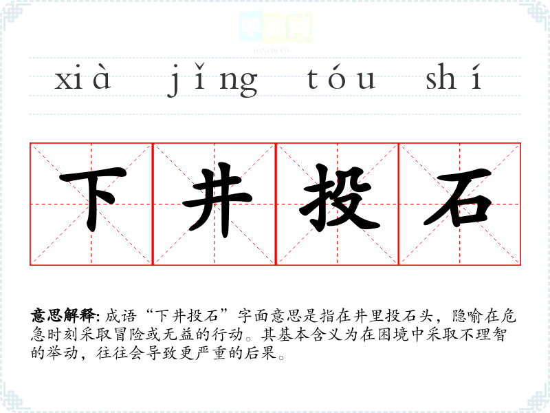 成语“下井投石”字面意思是指在井里投石头,隐喻在危急时刻采取冒险或无益的行动。其基本含义为在困境中采取不理智的举动,往往会导致更严重的后果。