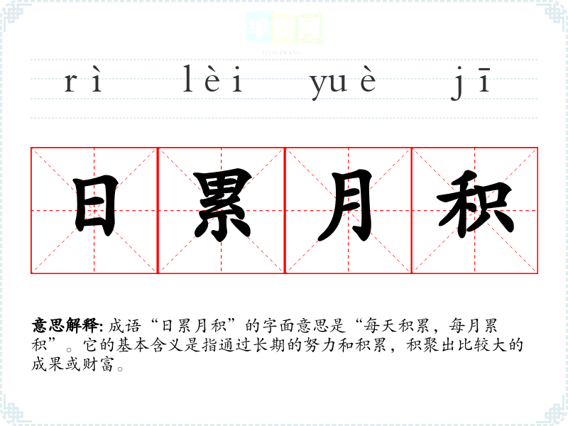 成语“日累月积”的字面意思是“每天积累,每月累积”。它的基本含义是指通过长期的努力和积累,积聚出比较大的成果或财富。