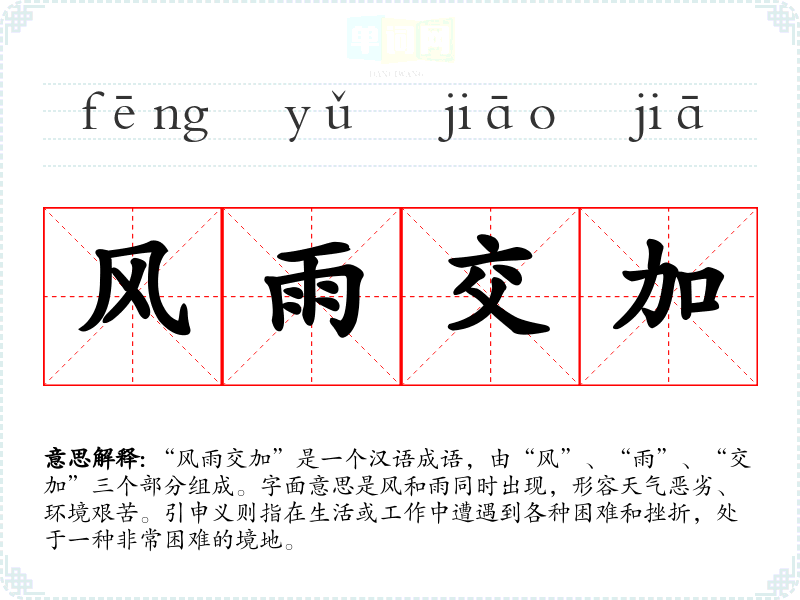 “风雨交加”是一个汉语成语,由“风”、“雨”、“交加”三个部分组成。字面意思是风和雨同时出现,形容天气恶劣、环境艰苦。引申义则指在生活或工作中遭遇到各种困难和挫折,处于一种非常困难的境地。