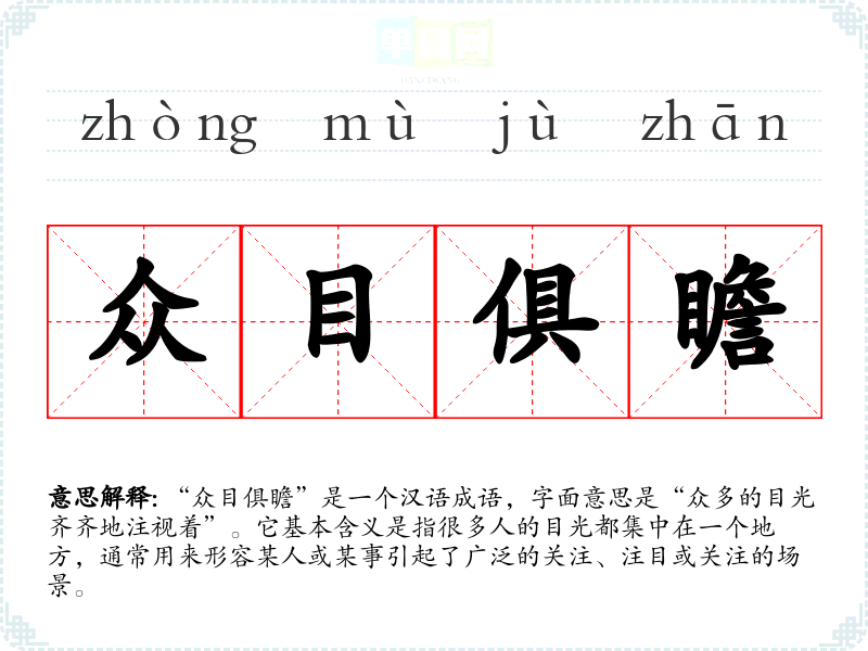 “众目俱瞻”是一个汉语成语,字面意思是“众多的目光齐齐地注视着”。它基本含义是指很多人的目光都集中在一个地方,通常用来形容某人或某事引起了广泛的关注、注目或关注的场景。