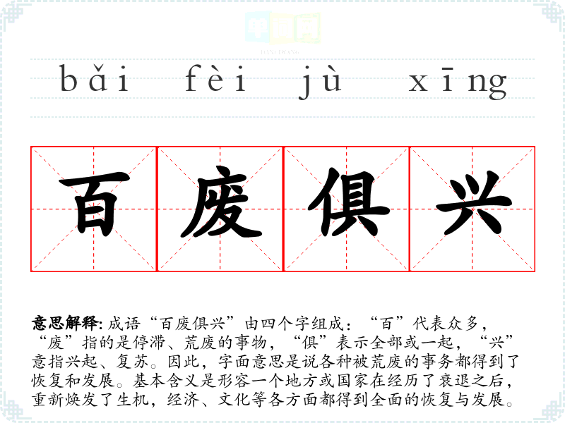 成语“百废俱兴”由四个字组成:“百”代表众多,“废”指的是停滞、荒废的事物,“俱”表示全部或一起,“兴”意指兴起、复苏。因此,字面意思是说各种被荒废的事务都得到了恢复和发展。基本含义是形容一个地方或国家在经历了衰退之后,重新焕发了生机,经济、文化等各方面都得到全面的恢复与发展。
