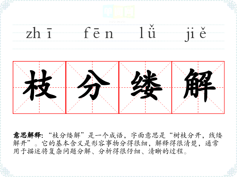 “枝分缕解”是一个成语,字面意思是“树枝分开,线缕解开”。它的基本含义是形容事物分得很细,解释得很清楚,通常用于描述将复杂问题分解、分析得很仔细、清晰的过程。