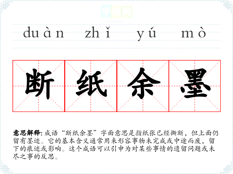 成语“断纸余墨”字面意思是指纸张已经撕断,但上面仍留有墨迹。它的基本含义通常用来形容事物未完成或中途而废,留下的痕迹或影响。这个成语可以引申为对某些事情的遗留问题或未尽之事的反思。