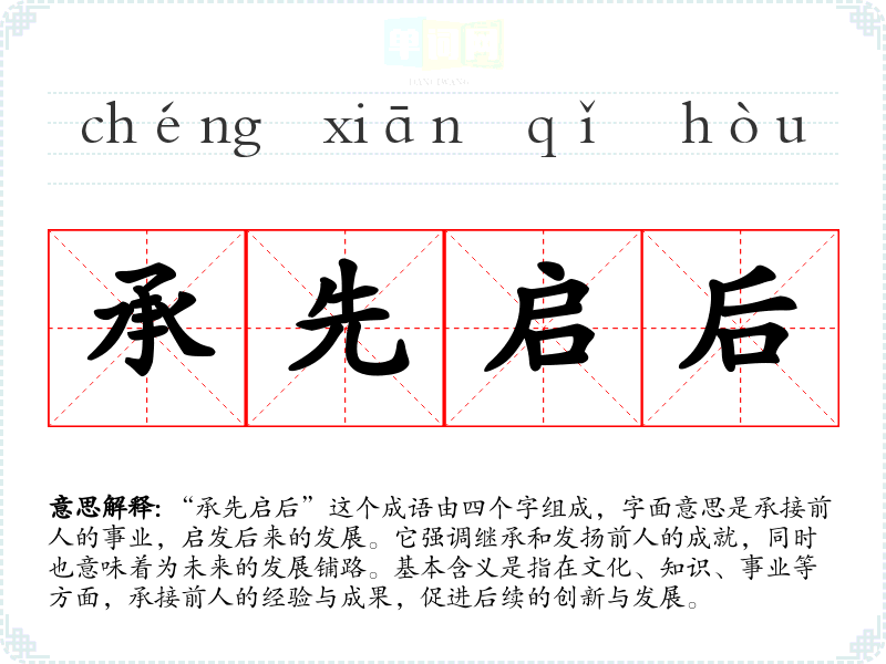 “承先启后”这个成语由四个字组成,字面意思是承接前人的事业,启发后来的发展。它强调继承和发扬前人的成就,同时也意味着为未来的发展铺路。基本含义是指在文化、知识、事业等方面,承接前人的经验与成果,促进后续的创新与发展。