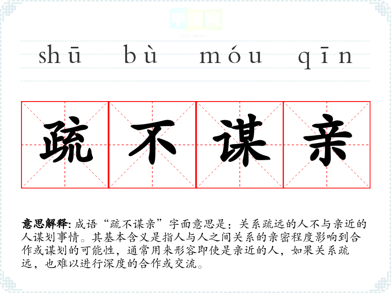 成语“疏不谋亲”字面意思是:关系疏远的人不与亲近的人谋划事情。其基本含义是指人与人之间关系的亲密程度影响到合作或谋划的可能性,通常用来形容即使是亲近的人,如果关系疏远,也难以进行深度的合作或交流。