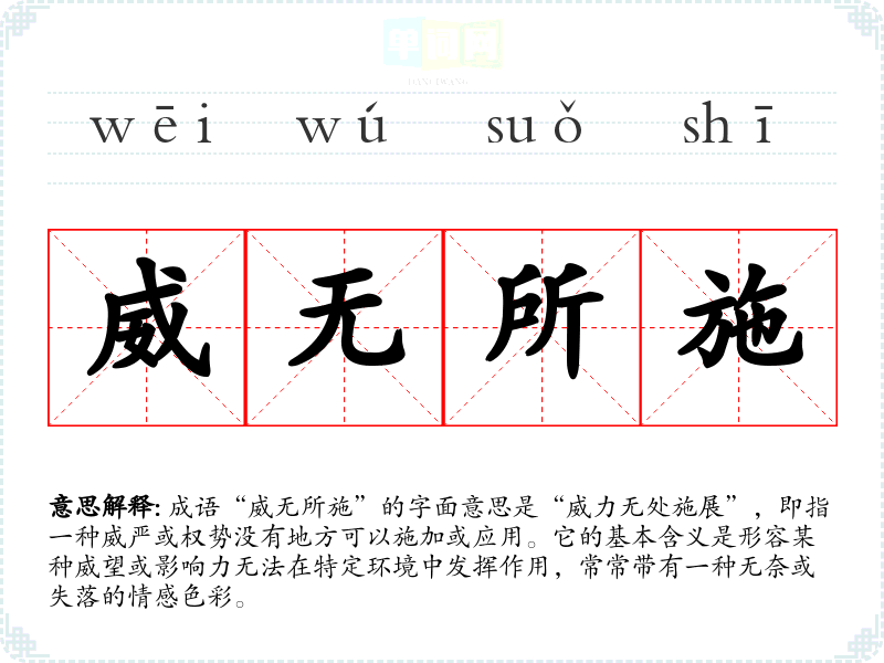成语“威无所施”的字面意思是“威力无处施展”,即指一种威严或权势没有地方可以施加或应用。它的基本含义是形容某种威望或影响力无法在特定环境中发挥作用,常常带有一种无奈或失落的情感色彩。