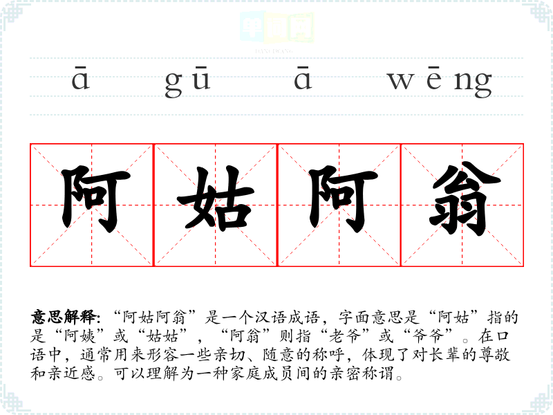“阿姑阿翁”是一个汉语成语,字面意思是“阿姑”指的是“阿姨”或“姑姑”,“阿翁”则指“老爷”或“爷爷”。在口语中,通常用来形容一些亲切、随意的称呼,体现了对长辈的尊敬和亲近感。可以理解为一种家庭成员间的亲密称谓。