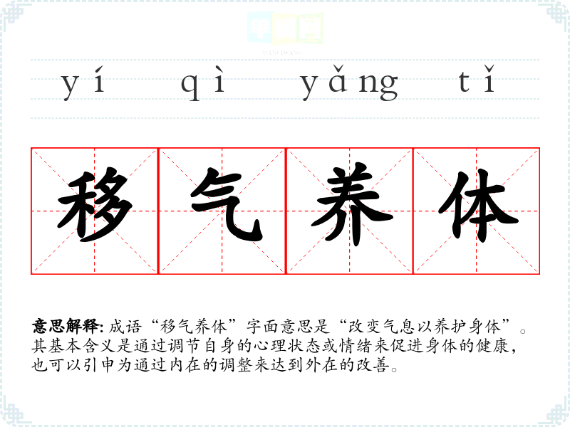 成语“移气养体”字面意思是“改变气息以养护身体”。其基本含义是通过调节自身的心理状态或情绪来促进身体的健康,也可以引申为通过内在的调整来达到外在的改善。