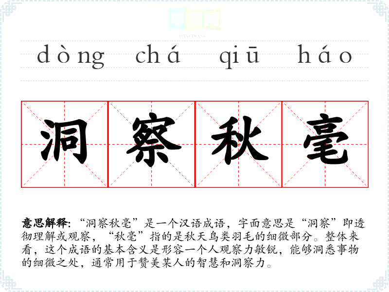 “洞察秋毫”是一个汉语成语,字面意思是“洞察”即透彻理解或观察,“秋毫”指的是秋天鸟类羽毛的细微部分。整体来看,这个成语的基本含义是形容一个人观察力敏锐,能够洞悉事物的细微之处,通常用于赞美某人的智慧和洞察力。