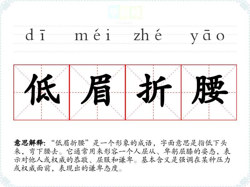 “低眉折腰”是一个形象的成语,字面意思是指低下头来,弯下腰去。它通常用来形容一个人屈从、卑躬屈膝的姿态,表示对他人或权威的恭敬、屈服和谦卑。基本含义是强调在某种压力或权威面前,表现出的谦卑态度。