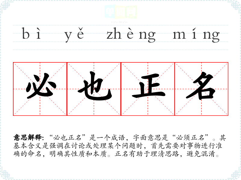 “必也正名”源自《论语》中的“子曰:‘必也正名乎!’”这句话,意指孔子认为在治理国家和社会时,必须要对事物进行准确的命名和界定,以便于人们的理解和行动。这一观点强调了语言的准确性与事物本质之间的关系。