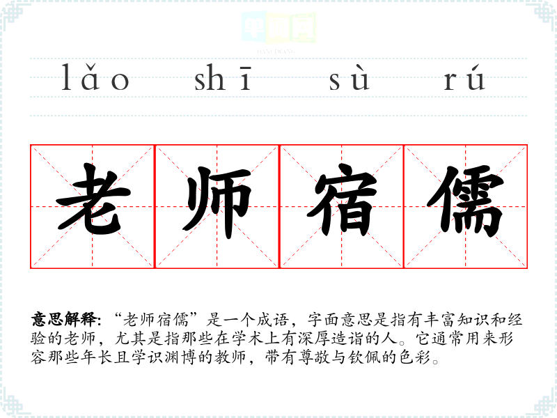 “老师宿儒”是一个成语,字面意思是指有丰富知识和经验的老师,尤其是指那些在学术上有深厚造诣的人。它通常用来形容那些年长且学识渊博的教师,带有尊敬与钦佩的色彩。