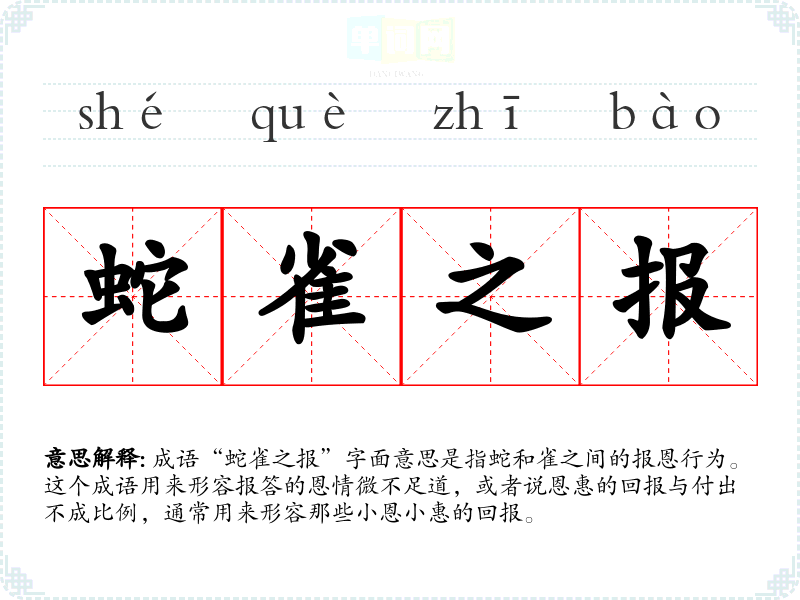 成语“蛇雀之报”字面意思是指蛇和雀之间的报恩行为。这个成语用来形容报答的恩情微不足道,或者说恩惠的回报与付出不成比例,通常用来形容那些小恩小惠的回报。