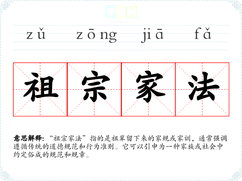 “祖宗家法”指的是祖辈留下来的家规或家训,通常强调遵循传统的道德规范和行为准则。它可以引申为一种家族或社会中约定俗成的规范和规章。