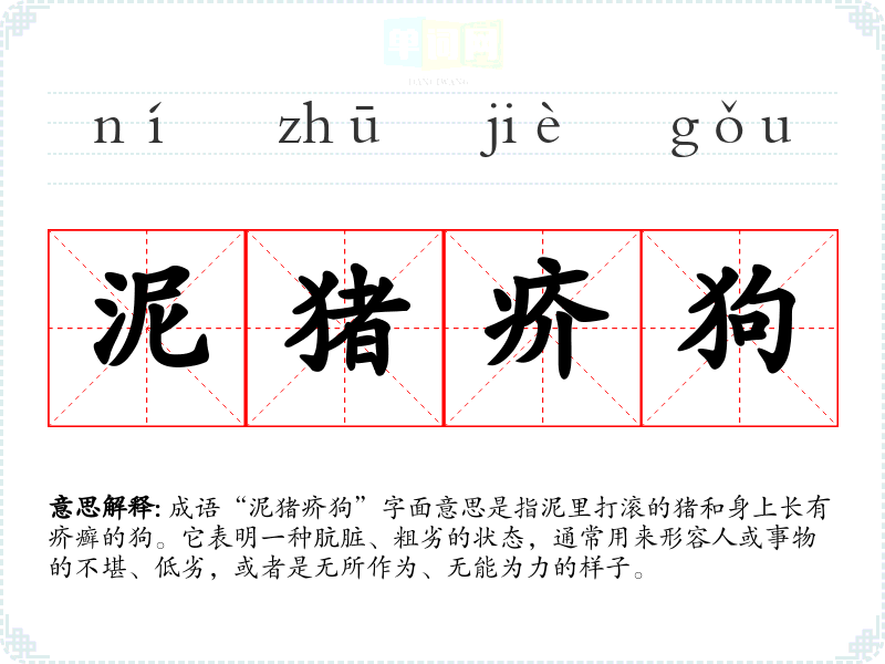 成语“泥猪疥狗”字面意思是指泥里打滚的猪和身上长有疥癣的狗。它表明一种肮脏、粗劣的状态,通常用来形容人或事物的不堪、低劣,或者是无所作为、无能为力的样子。