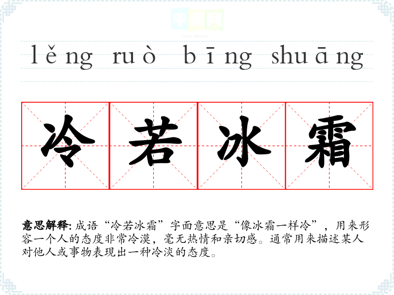 成语“冷若冰霜”字面意思是“像冰霜一样冷”,用来形容一个人的态度非常冷漠,毫无热情和亲切感。通常用来描述某人对他人或事物表现出一种冷淡的态度。