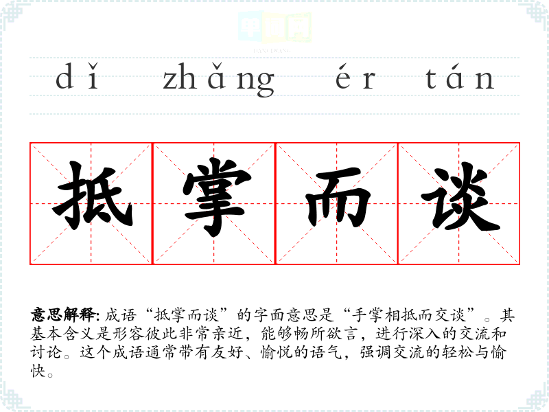 成语“抵掌而谈”的字面意思是“手掌相抵而交谈”。其基本含义是形容彼此非常亲近,能够畅所欲言,进行深入的交流和讨论。这个成语通常带有友好、愉悦的语气,强调交流的轻松与愉快。