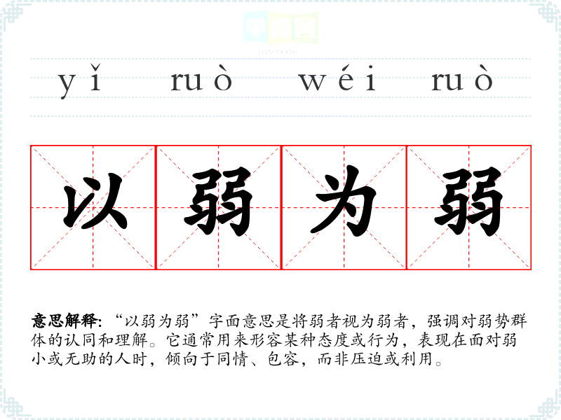 “以弱为弱”并不是一个传统的成语,它更像是一种现代化的表达方式,反映了对弱势群体的关注与尊重。从**传统文化的角度来看,这种态度与“仁爱”思想相契合,强调对弱者的关怀和尊重。