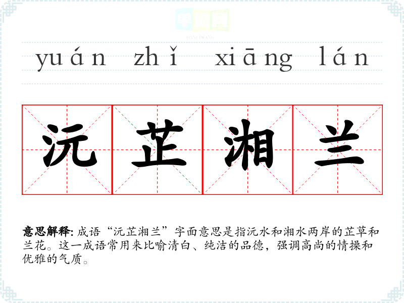 成语“沅芷湘兰”字面意思是指沅水和湘水两岸的芷草和兰花。这一成语常用来比喻清白、纯洁的品德,强调高尚的情操和优雅的气质。