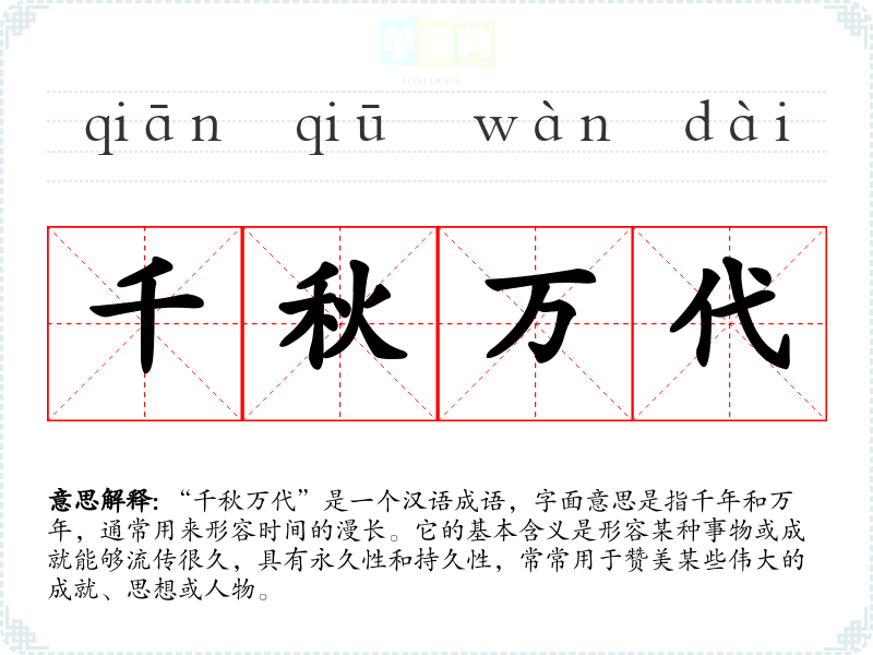 “千秋万代”是一个汉语成语,字面意思是指千年和万年,通常用来形容时间的漫长。它的基本含义是形容某种事物或成就能够流传很久,具有永久性和持久性,常常用于赞美某些伟大的成就、思想或人物。