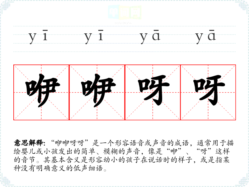 “咿咿呀呀”是一个形容语音或声音的成语,通常用于描绘婴儿或小孩发出的简单、模糊的声音,像是“咿”、“呀”这样的音节。其基本含义是形容幼小的孩子在说话时的样子,或是指某种没有明确意义的低声细语。